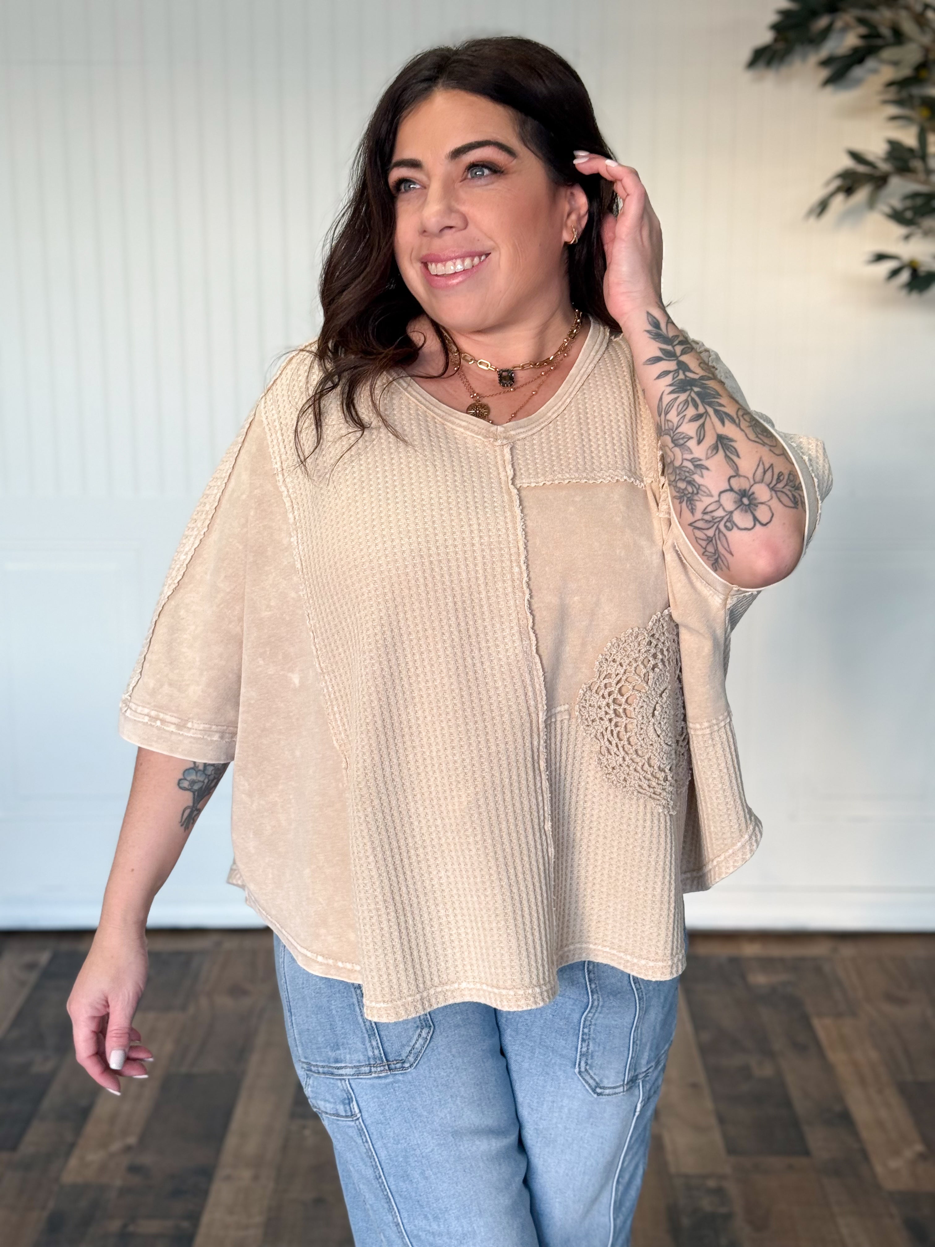 Elevate your everyday comfort with our Boho Crochet Patch Oversized Thermal Top. This isn't just a basic loungewear piece; it’s a style statement. Crafted from a premium mineral-washed knit, this top features intricate crochet lace patches that add a touch of vintage, artisanal charm. With its relaxed, oversized silhouette and breathable thermal texture, it offers a "lived-in" feel from the very first wear. Whether you’re styling it as a chic matching set or pairing it with your favorite denim, this top is the ultimate blend of cozy farmhouse vibes and modern effortless fashion.