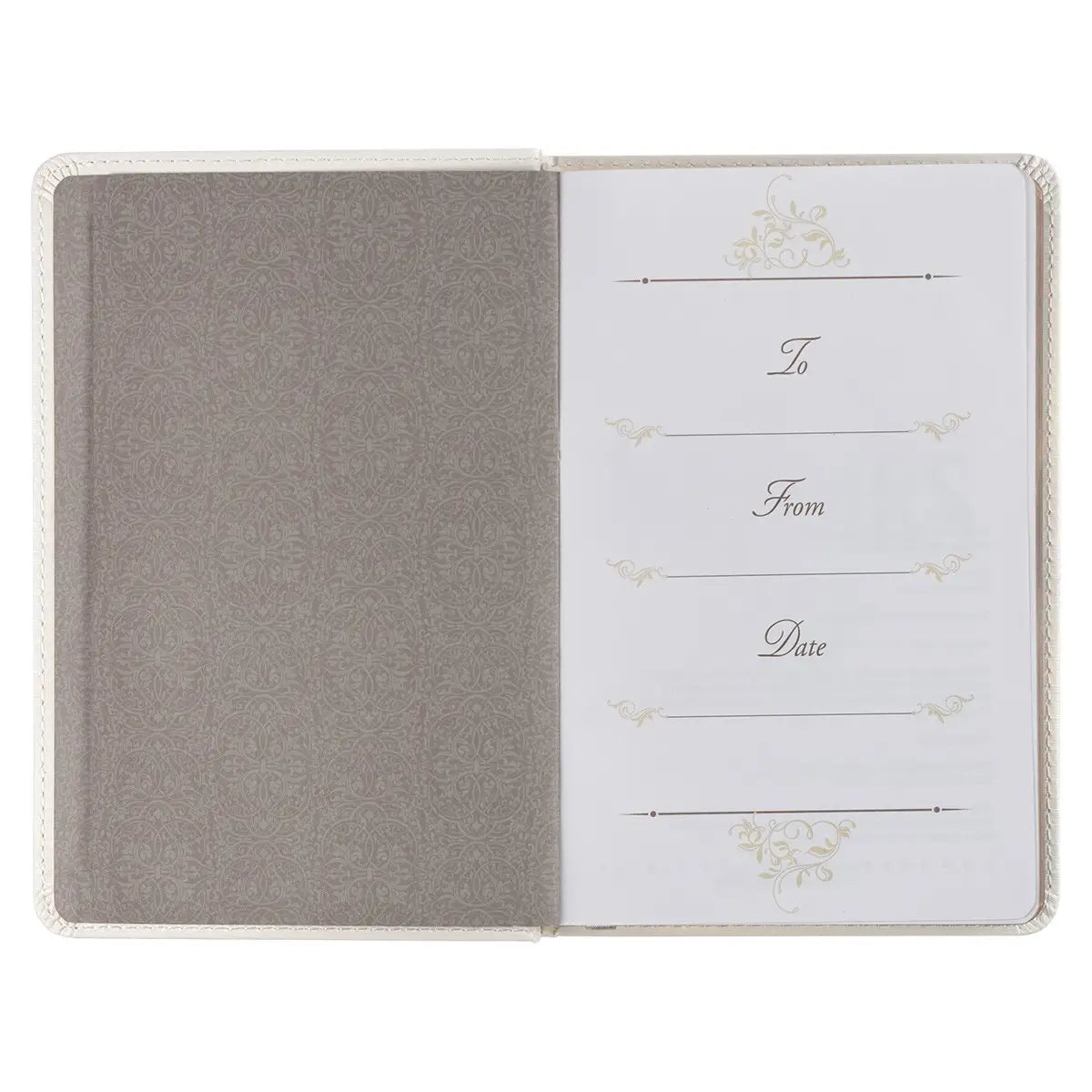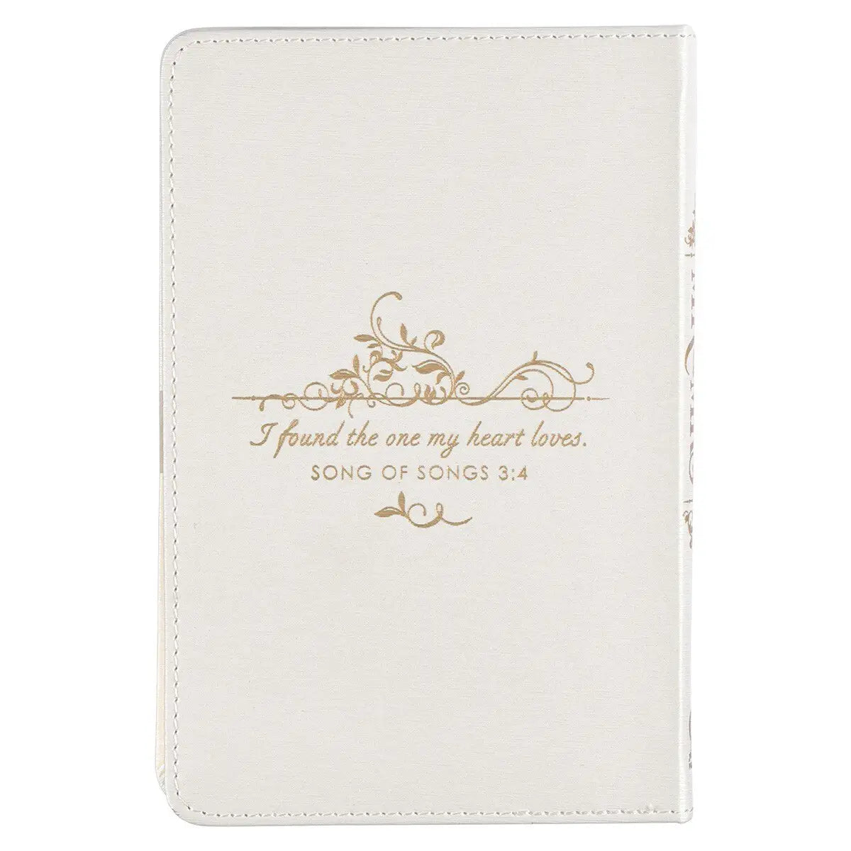 The Mr. & Mrs. 366 Devotions for Couples White Faux Leather Devotional is a great starting point for a new marriage and the perfect way to get into the habit of sharing your devotional time as a couple. White pearlized faux leather cover with heat-debossed floral design, Mr. & Mrs. — Better Together Collection, Gold foiled title, Flexcover, 366 devotions, Couple's devotional, 388 gilt-edged pages, Two-color interior, Satin ribbon marker, Size: 7.2" x 4.8" x .7" (183 x 122 x 18mm)