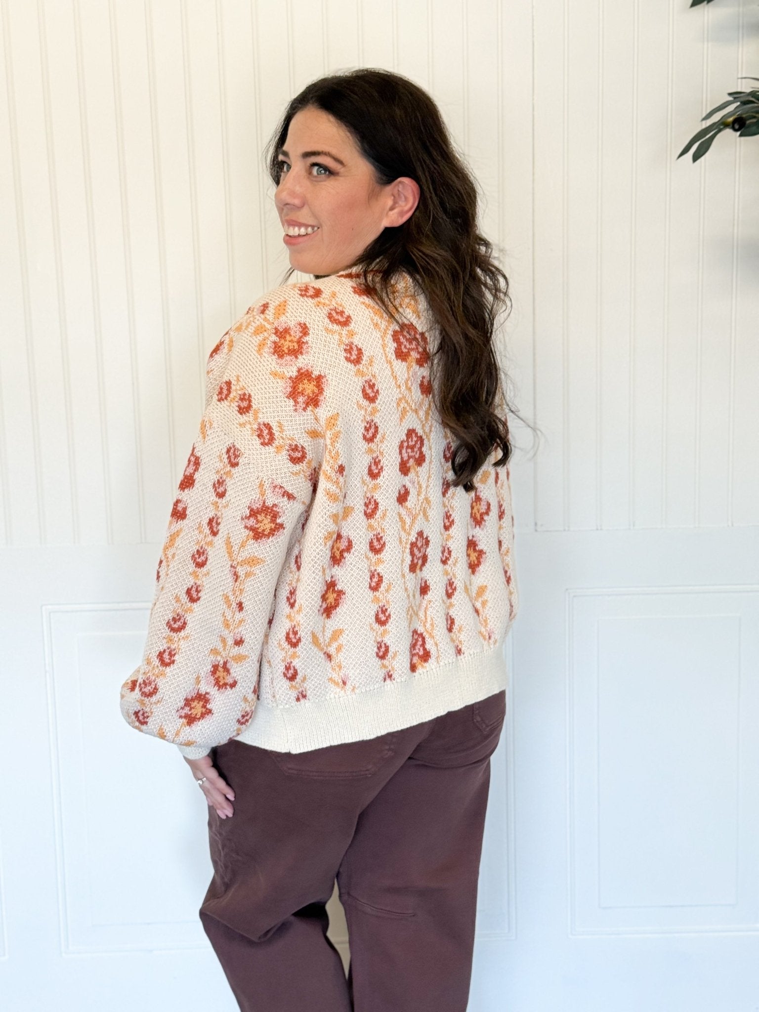 Bring a little charm into your everyday style with this floral knit cardigan. The soft, relaxed fit and slightly cropped length make it the perfect piece to toss on with high-waisted jeans or layer over a flowy dress. With its button-down front, balloon sleeves, and all-over floral pattern, it’s that easy cardigan that feels both playful and timeless—ideal for coffee dates, errands, or cozy nights in.
