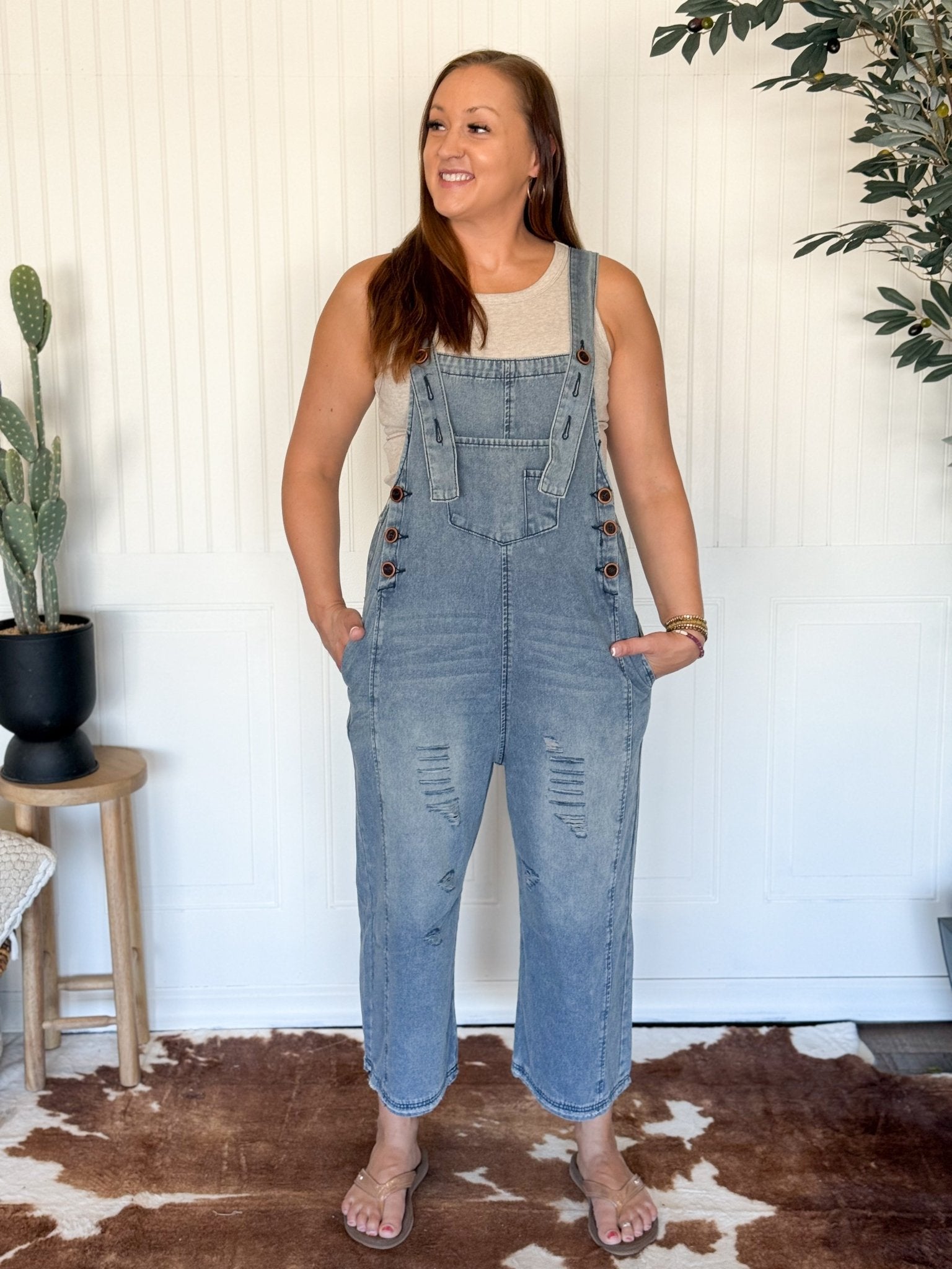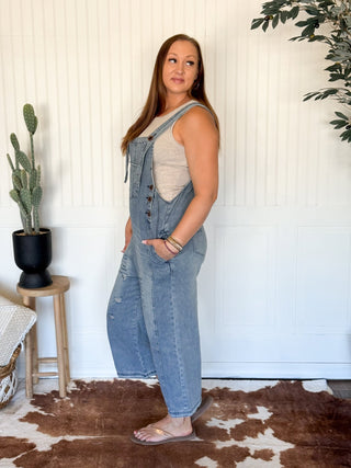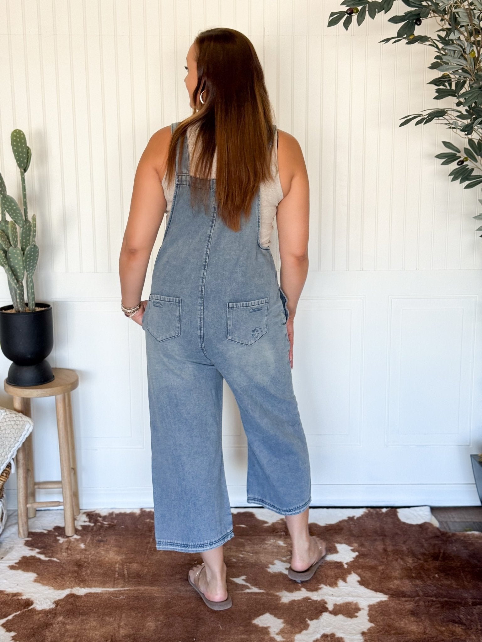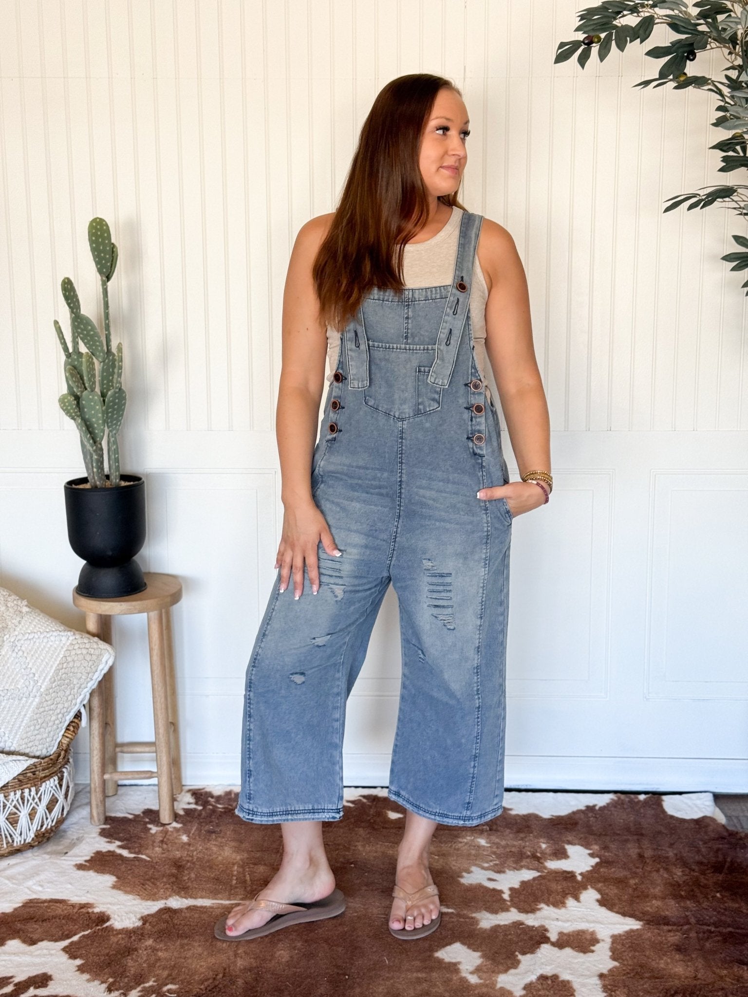 Rock Ridge Urban Chic Wide Leg Denim Overall Jumpsuit - Distressed Denim