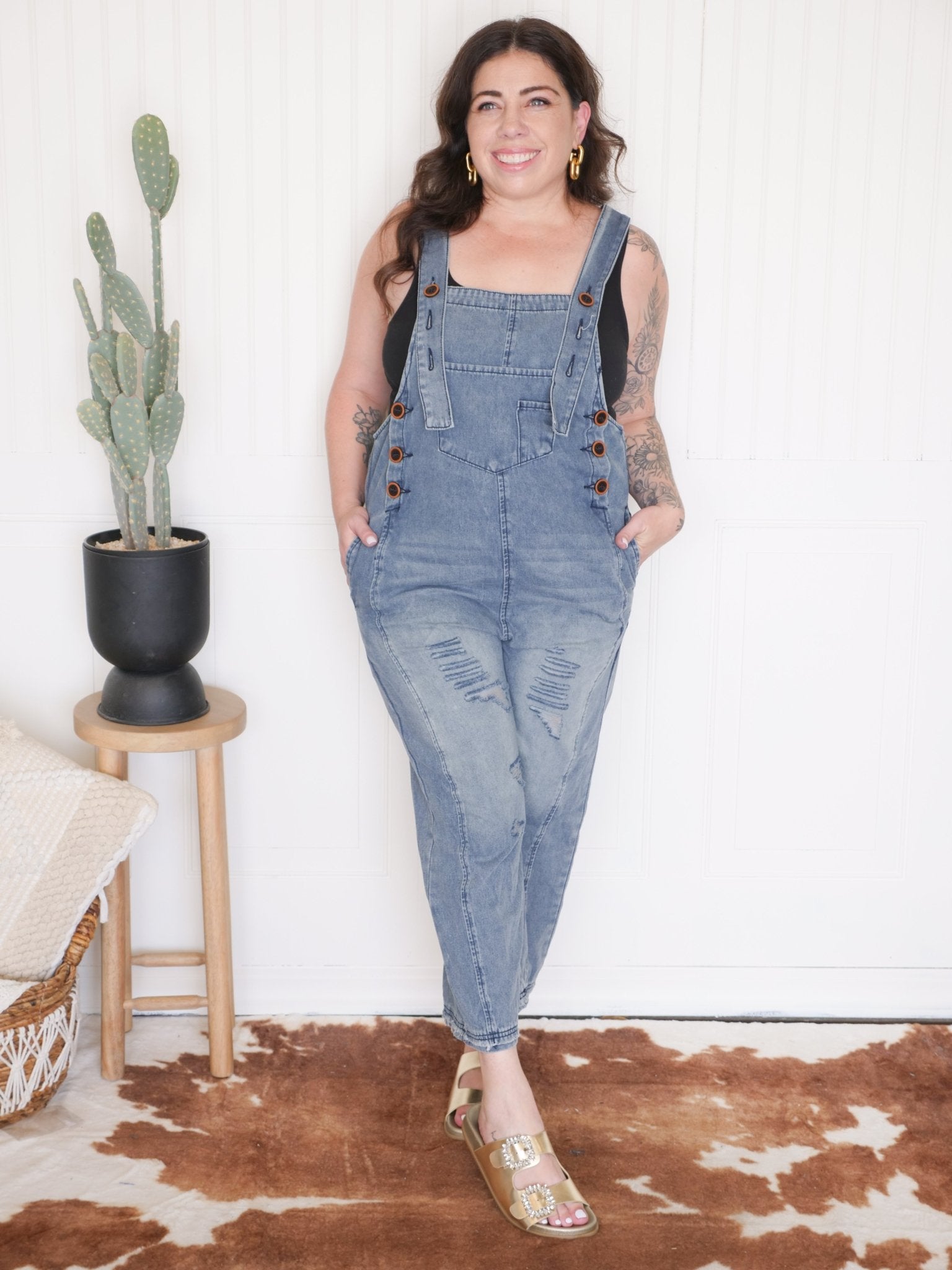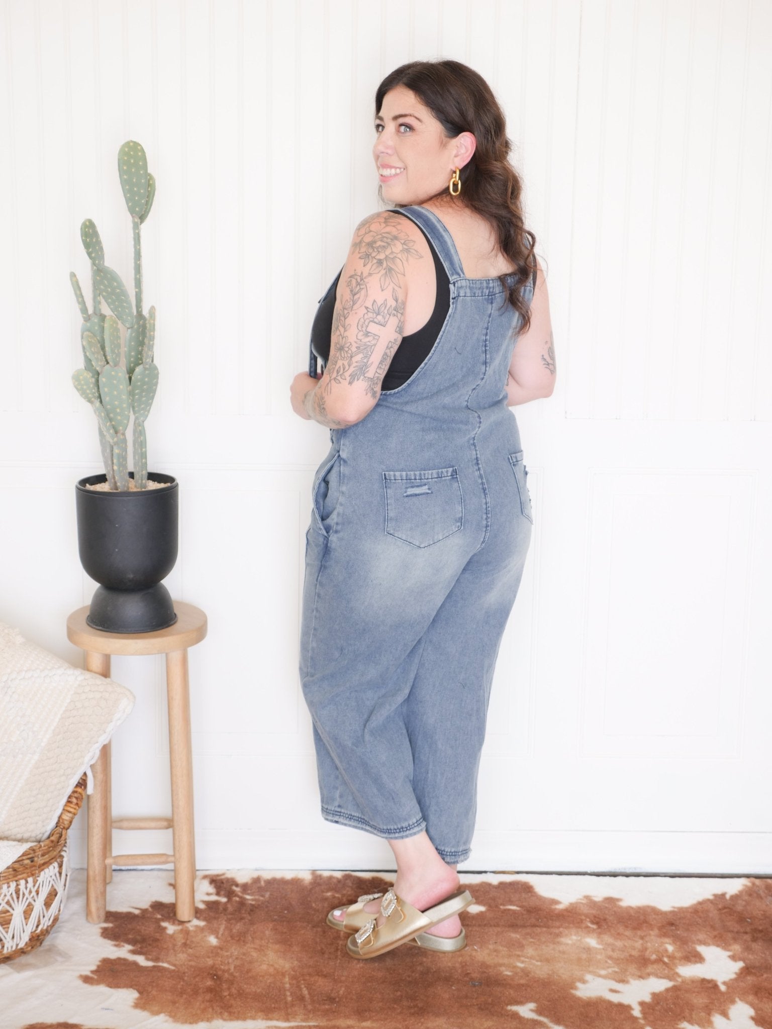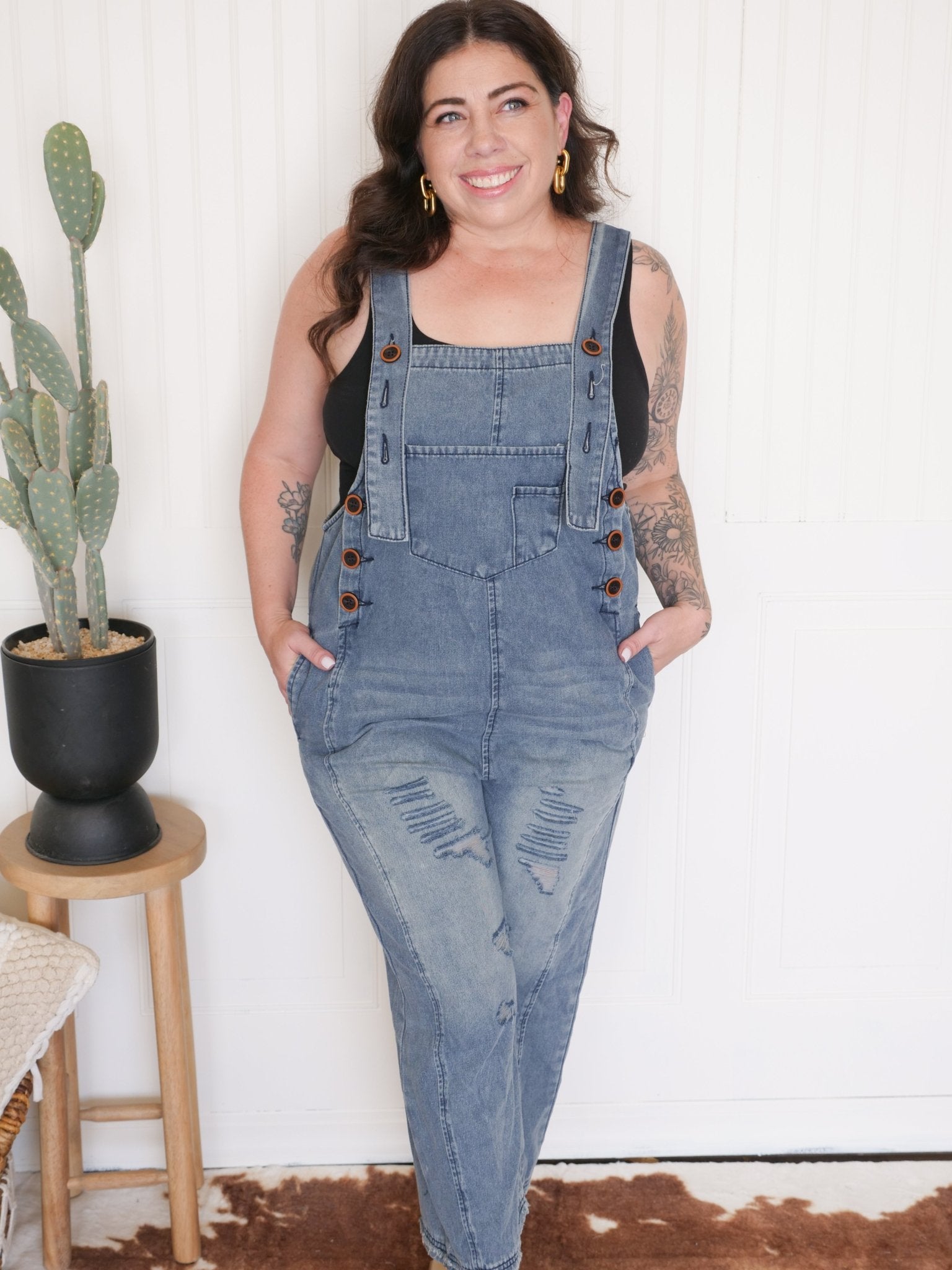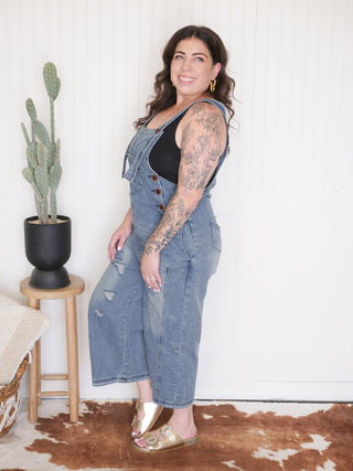 Rock Ridge Urban Chic Wide Leg Denim Overall Jumpsuit - Distressed Denim