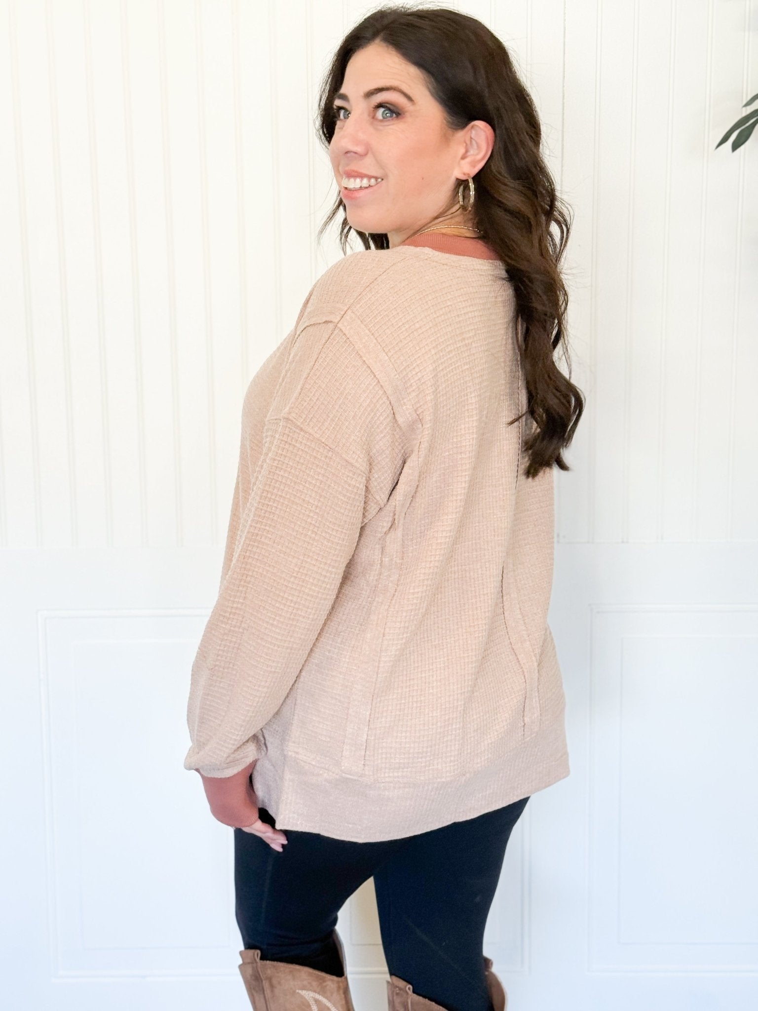 The Sierra Brushed Thermal Pullover is that perfect oversized staple you’ll want to cozy up in all season long. Made from a soft blend of rayon, polyester, nylon, and a hint of spandex, it offers just the right balance of warmth, stretch, and breathability. Its brushed thermal texture gives it a plush, lived-in feel, while the oversized silhouette makes it easy to throw on with leggings, jeans, or joggers.