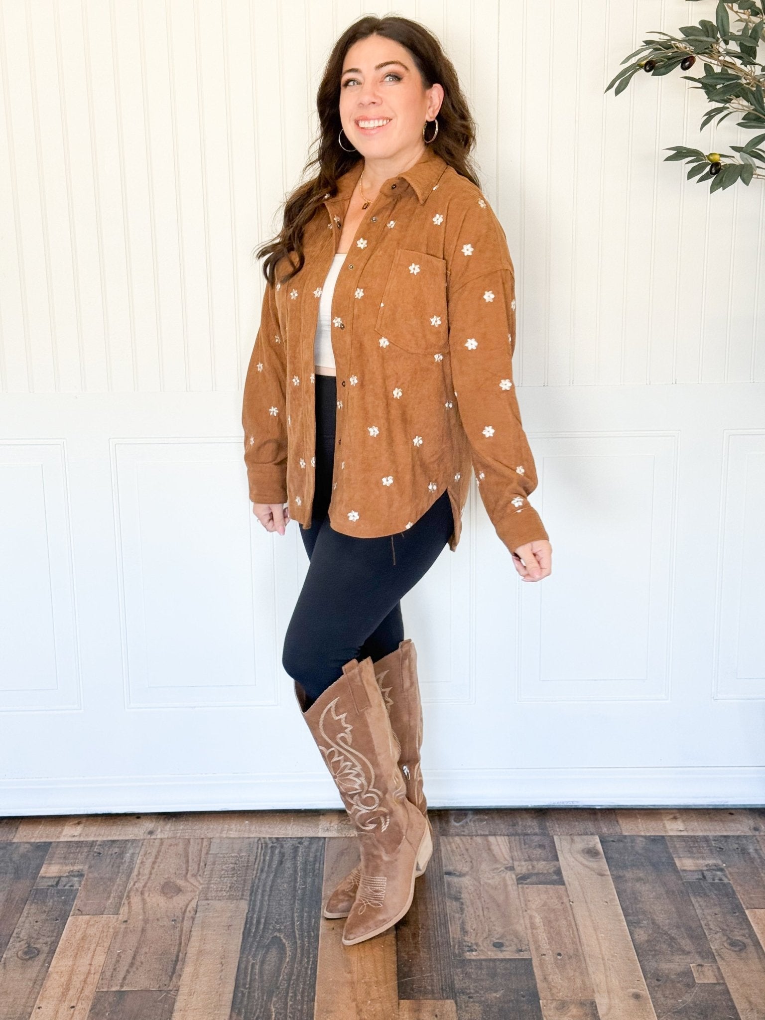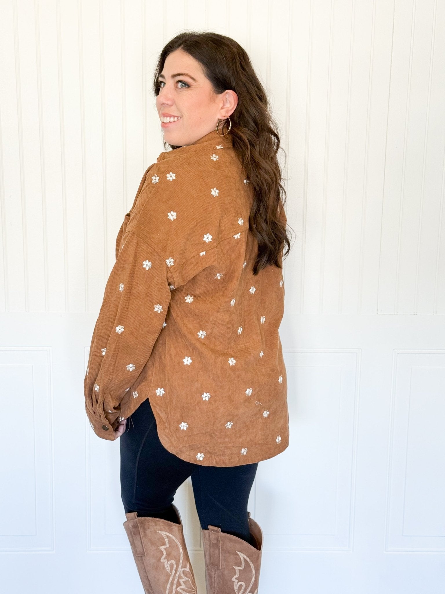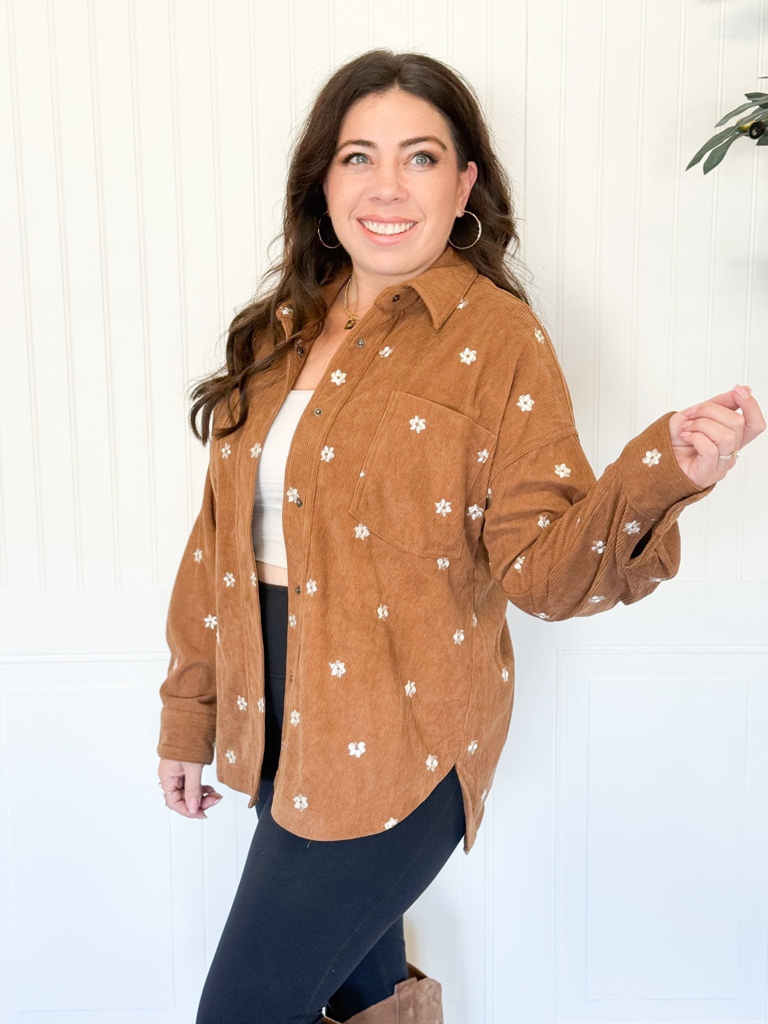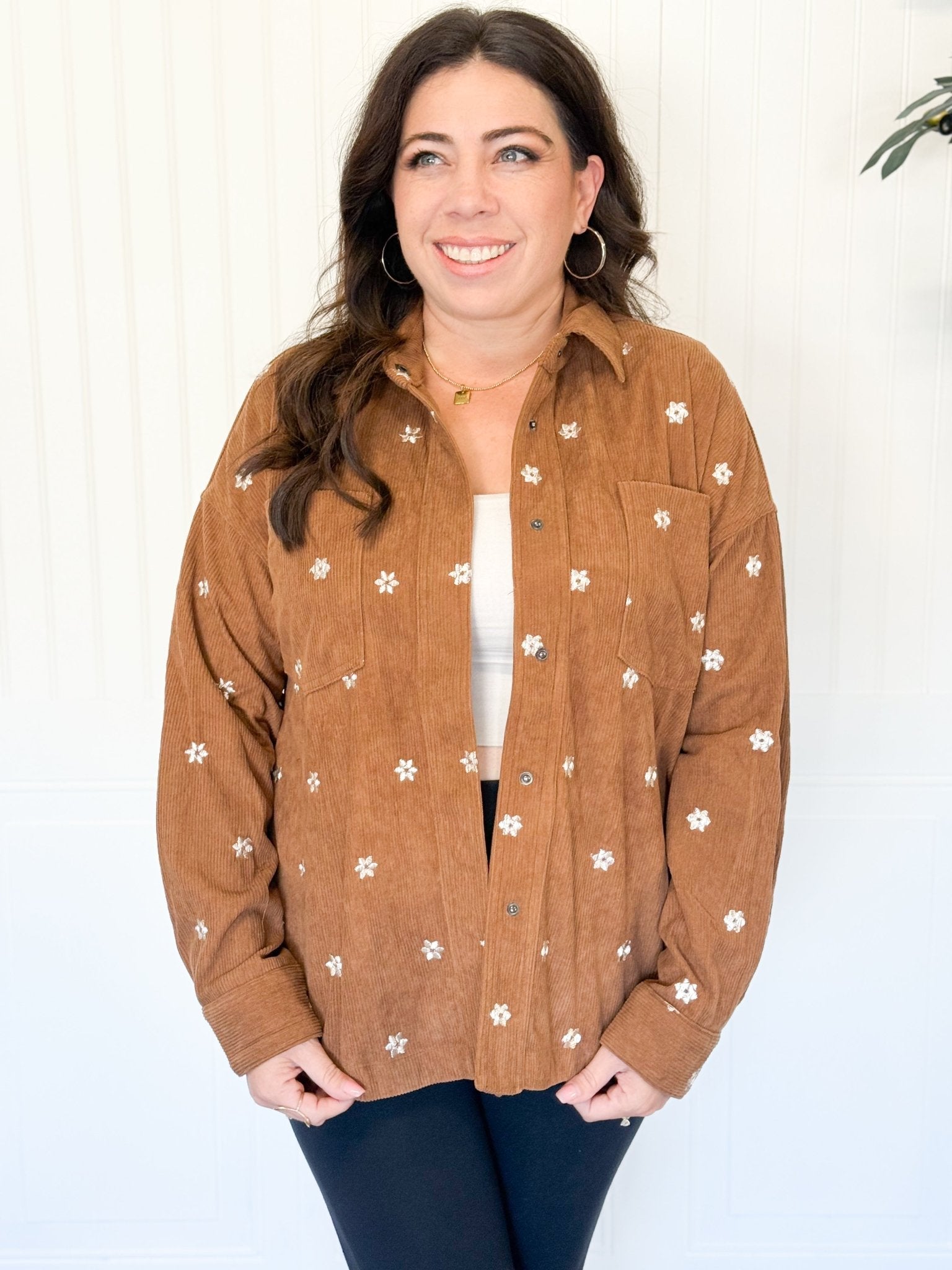The Prairie Bloom Corduroy Shirt is a cozy oversized layer with a feminine twist. Made from soft corduroy and detailed with delicate floral embroidery, it blends rustic charm with everyday comfort. Its oversized fit and button-down design make it perfect for layering over tees, tanks, or dresses, while the textured fabric adds just the right amount of warmth and style for cooler seasons.