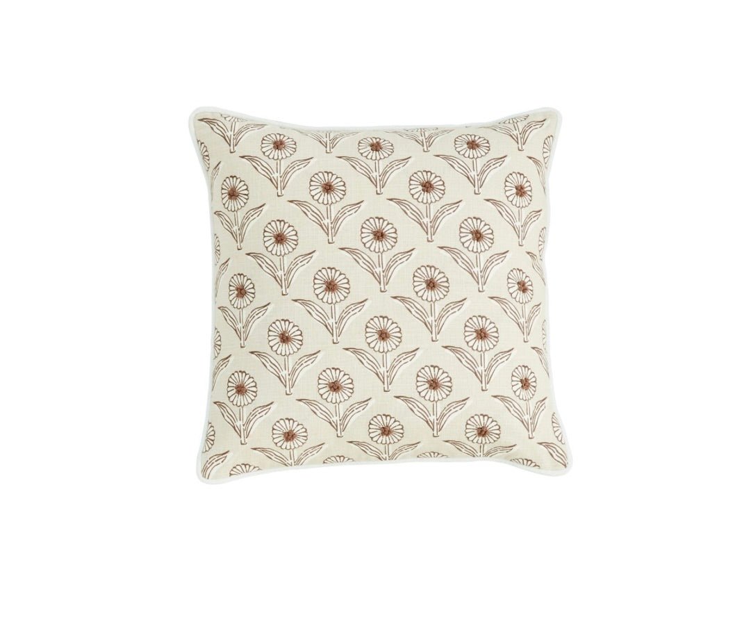 This chambray pillow is what happens when texture, color, and craftsmanship come together just right. With a hand-touched block print, delicate French knot detailing, soft velvet piping, and a sturdy canvas backing—it's full of those thoughtful little details that make a space feel special.