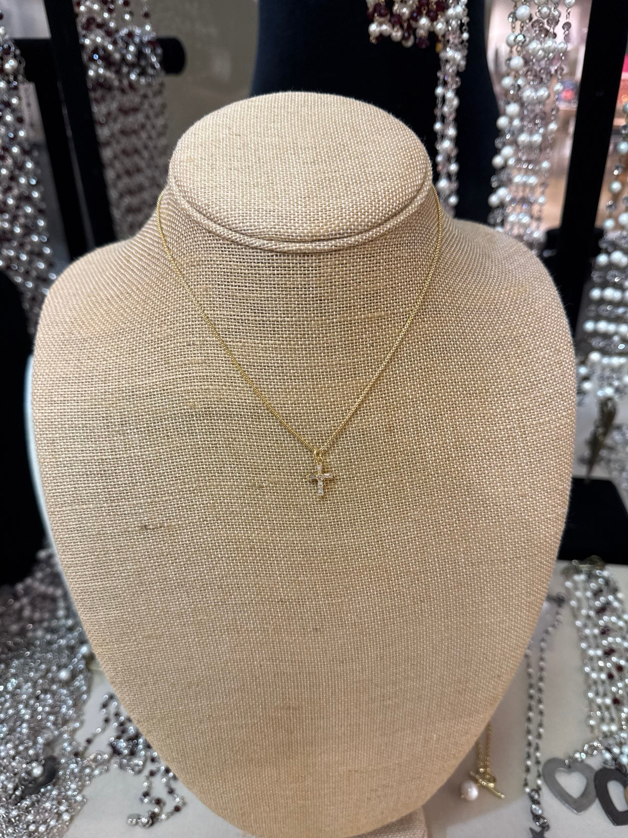 This is one of those simple pieces that feels special every time you put it on. The delicate gold cross is accented with tiny crystals that catch the light just enough without feeling flashy. It’s meaningful, pretty, and easy to wear every single day — whether you’re dressed up or just in a tee and jeans.
