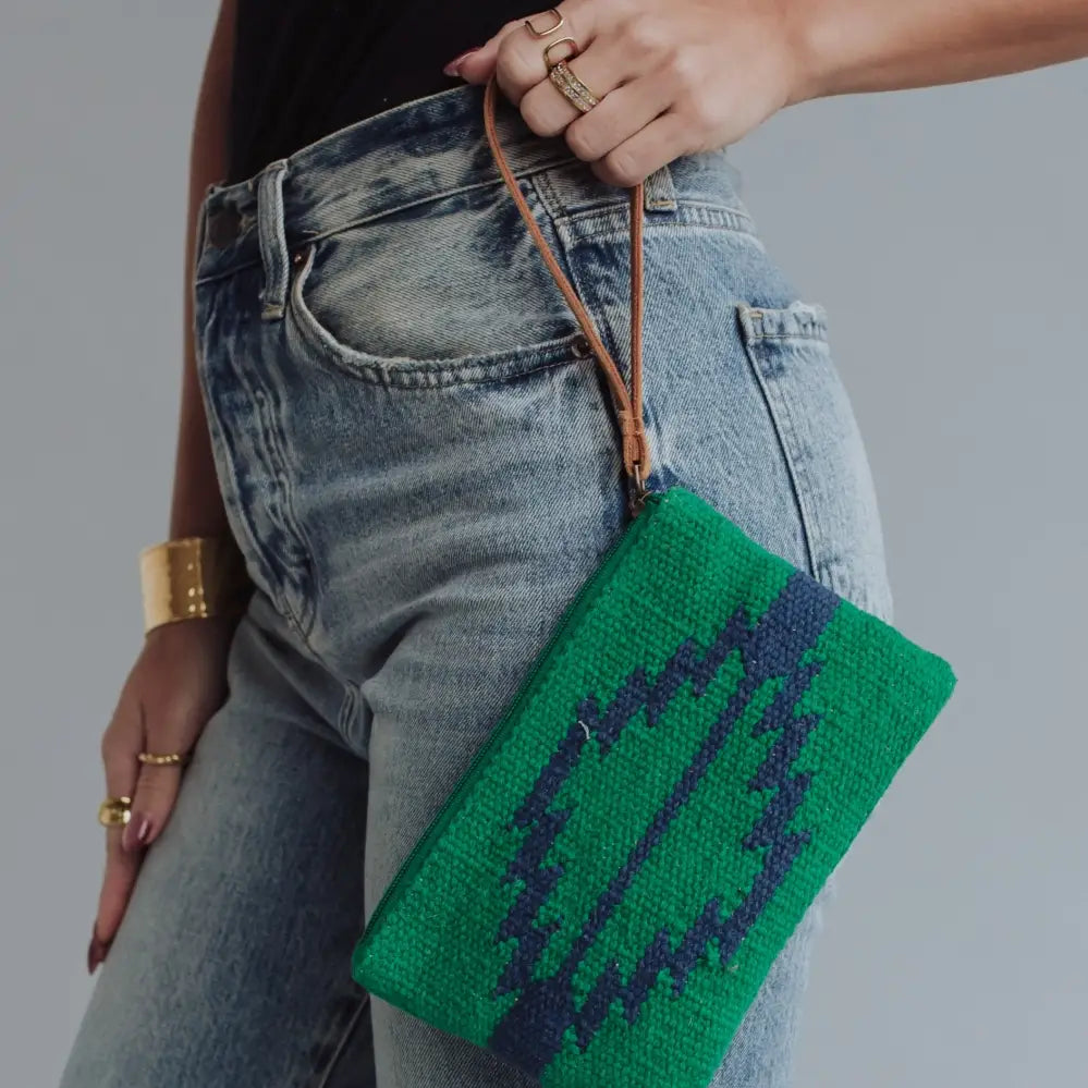 This is one of those grab-and-go pieces that somehow works with everything. The green and navy Aztec pattern gives it that subtle western vibe without being loud, and the leather pull adds just the right touch of texture. Perfect for errands, games, or nights when you only want the essentials and nothing extra.