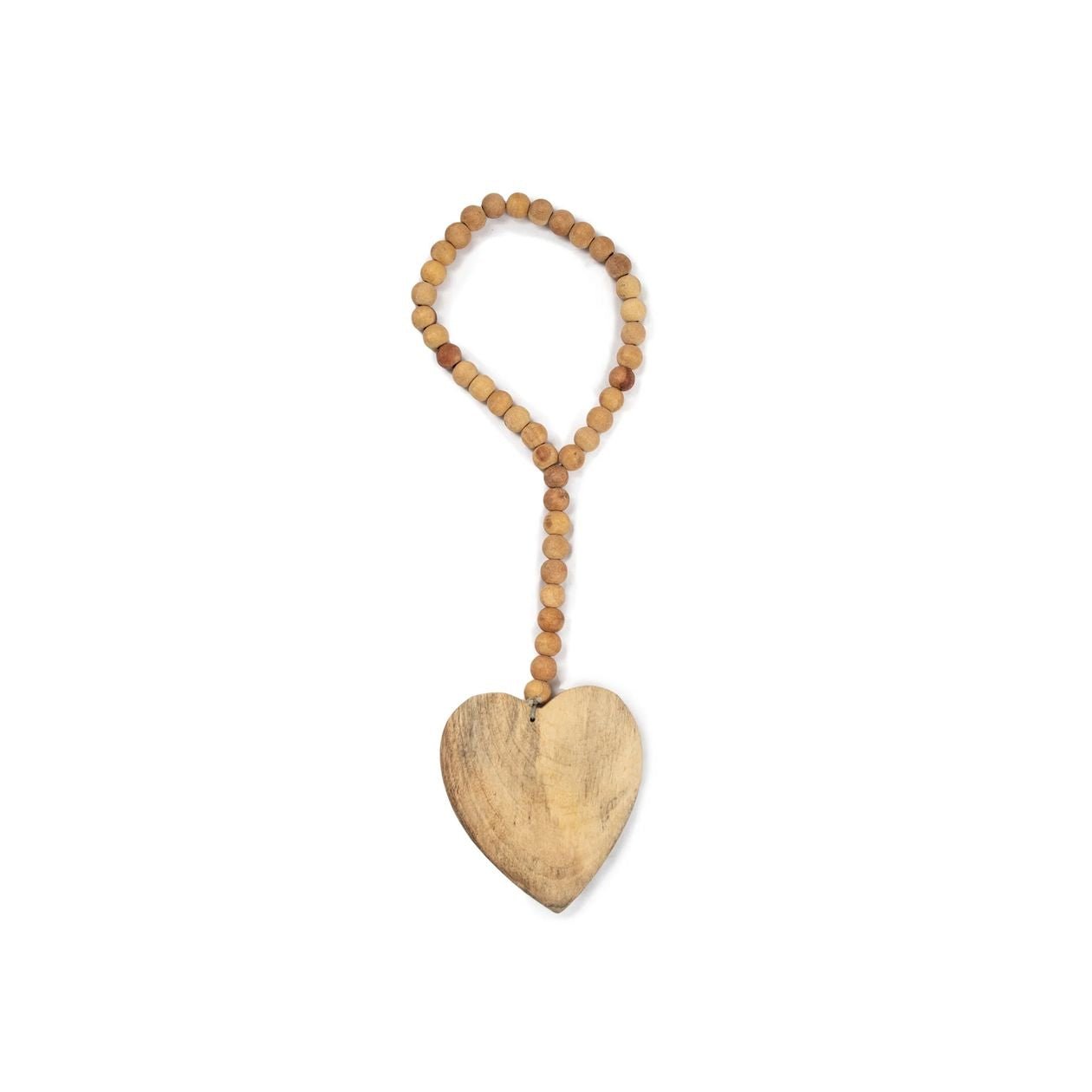 The wood beads used are antique and are brittle. You can expect the antiquing to come off the wood beads. A symbol of love, luck, and meditation, these wooden beads with a heart pendant look great draped on a mirror, garden trellis, or down the center of a coffee table.