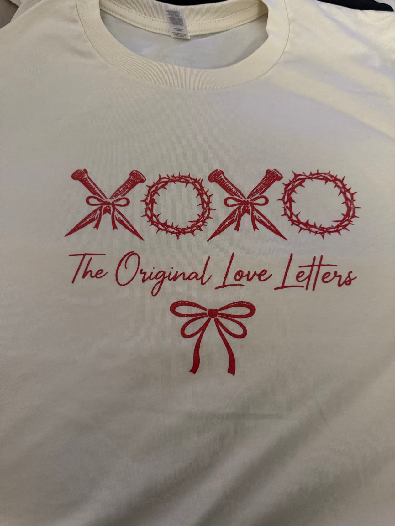 • “XOXO the original love letter” design referencing Jesus and the Bible