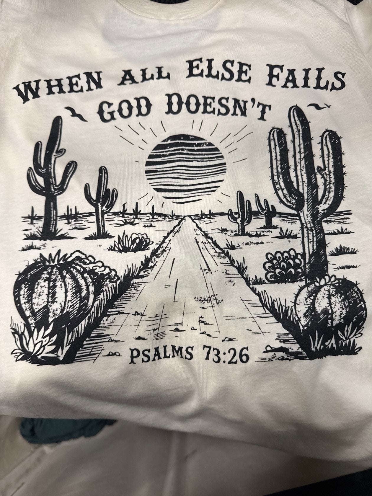 This tee is a quiet reminder for the hard days — the kind of message that meets you right where you are. Featuring a peaceful desert scene paired with the words “When all else fails, God doesn’t,” it speaks truth in a calm, steady way. Thoughtful, meaningful, and easy to wear, it’s a piece you’ll reach for when you want comfort in more ways than one.