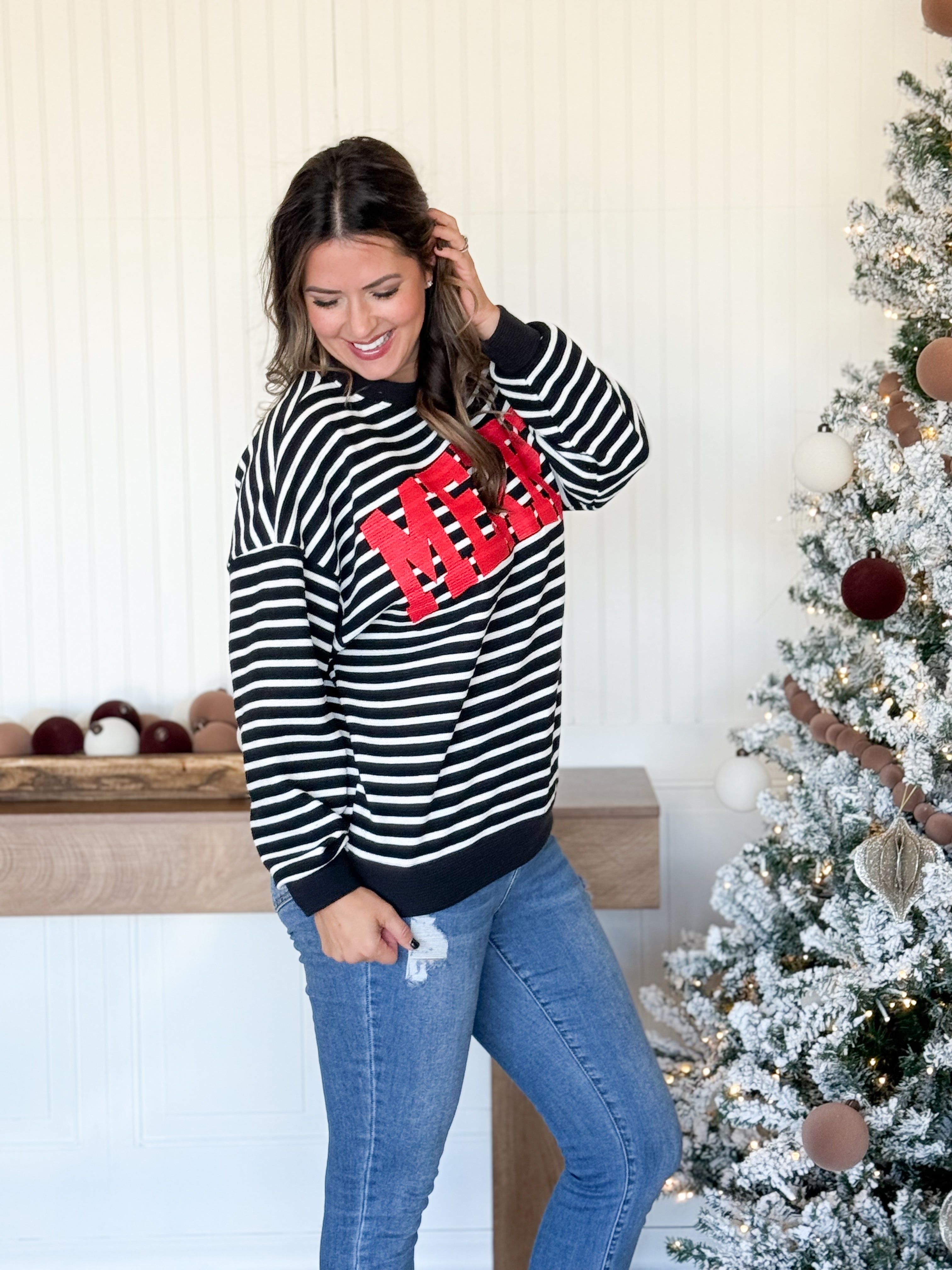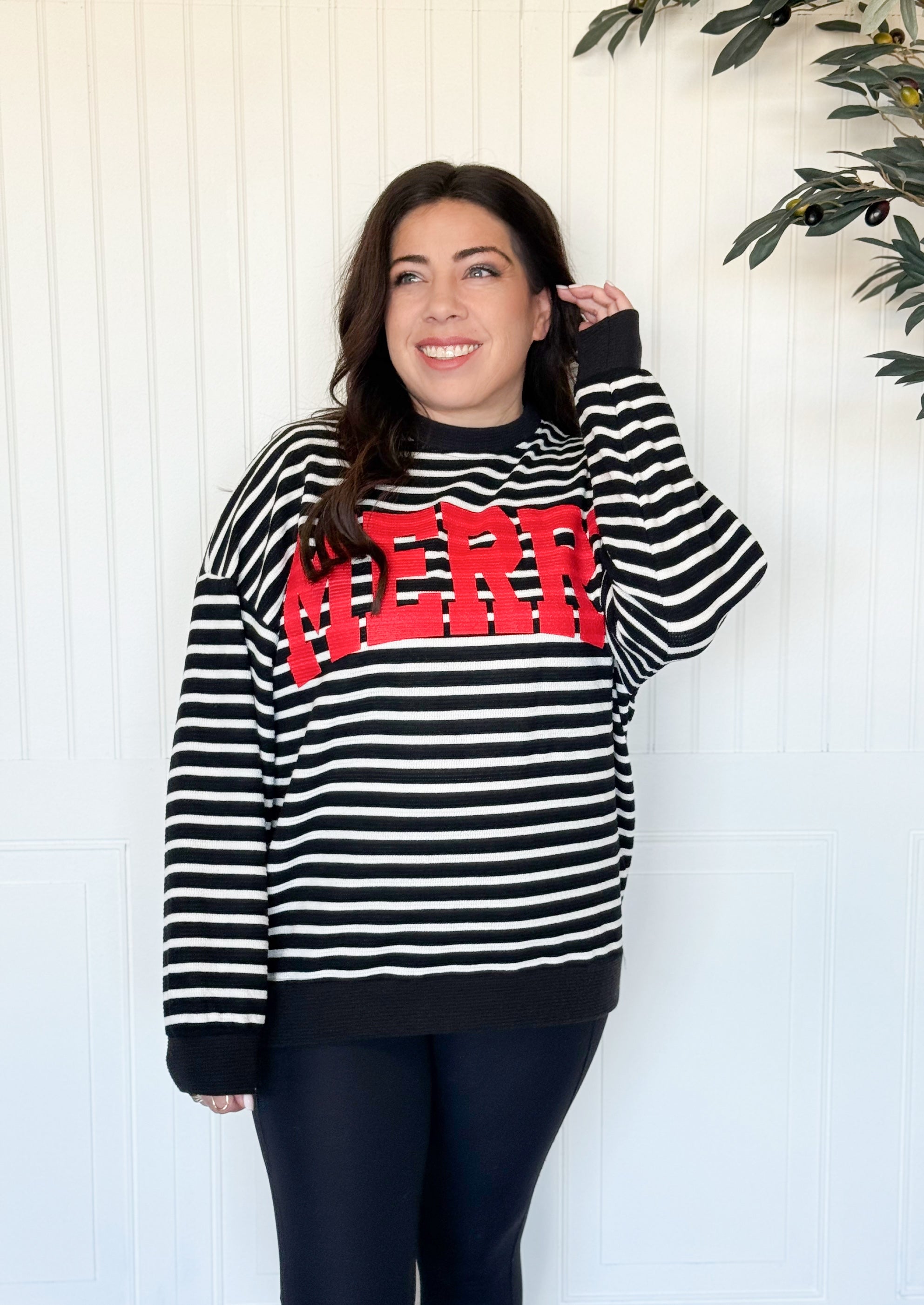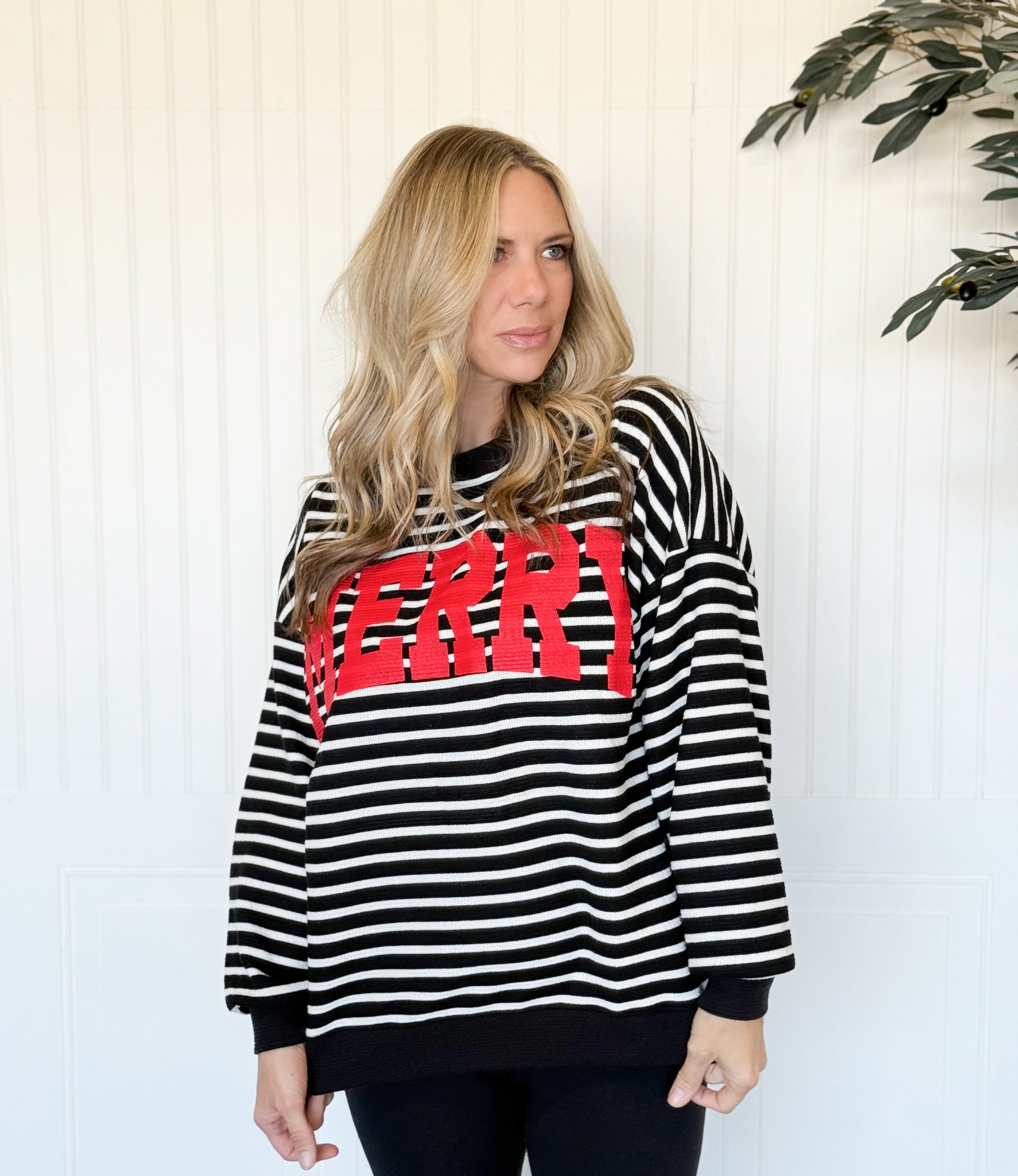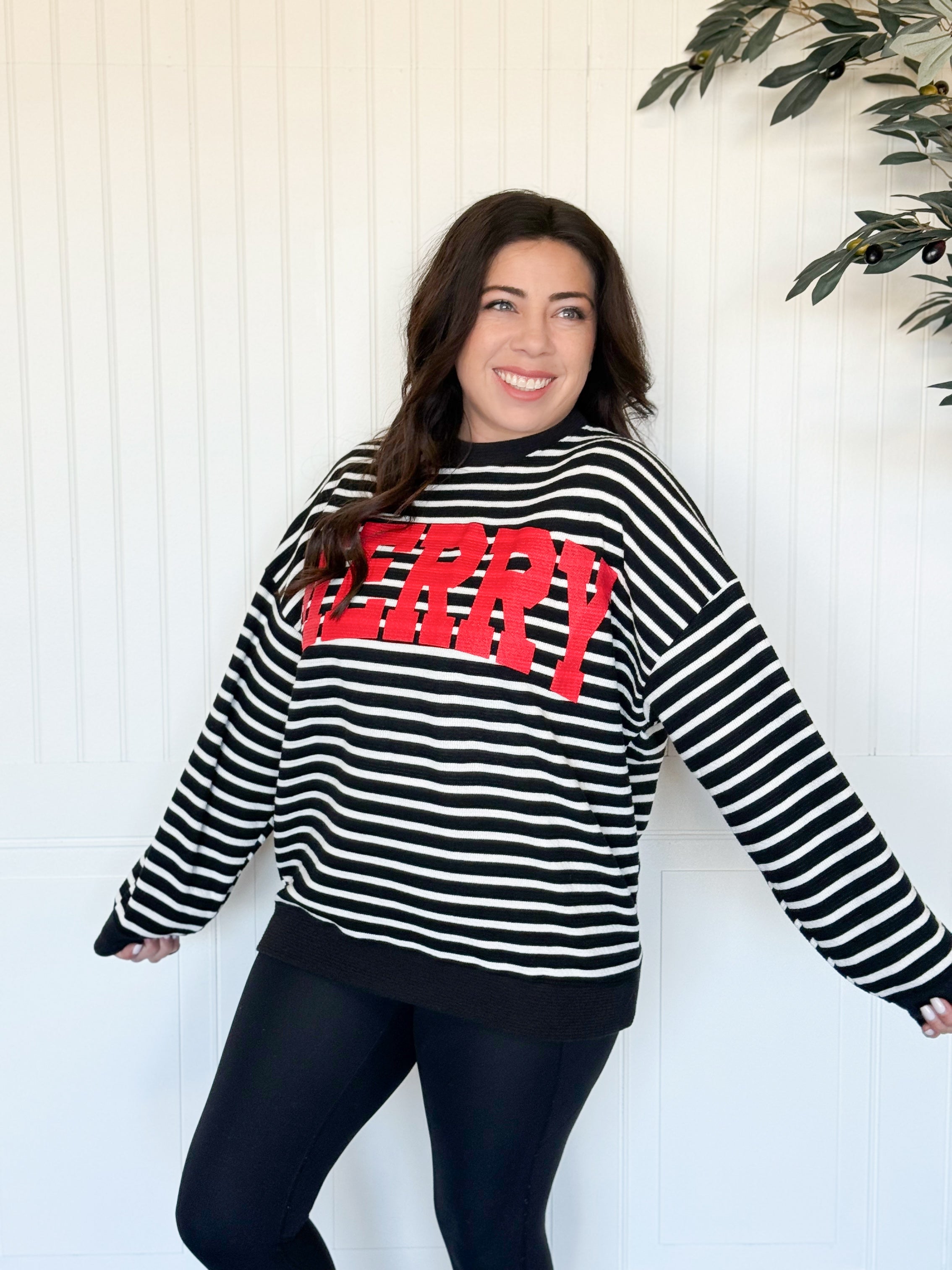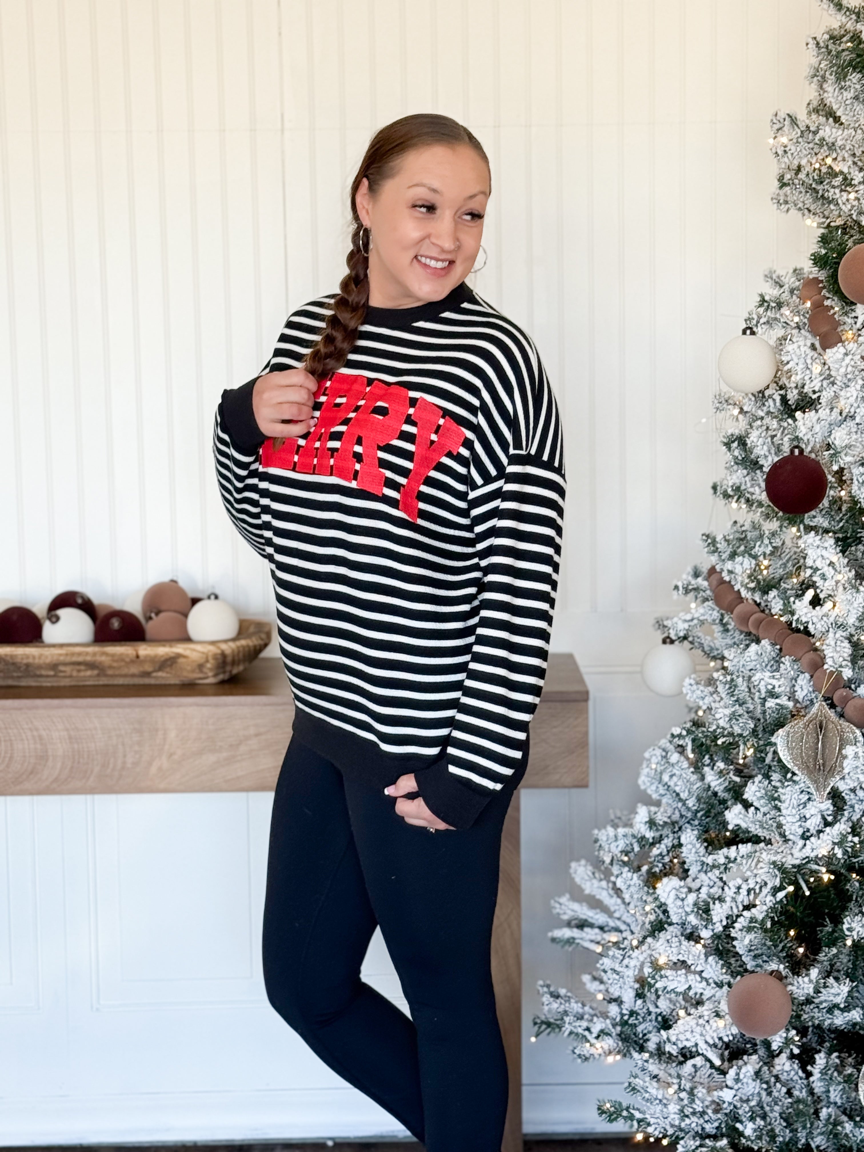The Merry Striped Cloud Knit Top captures the cozy charm of the holidays with a modern, elevated twist. Crafted from luxuriously soft cloud-knit fabric, this top features cheerful stripes and a festive “Merry” graphic — making it the perfect blend of comfort and seasonal spirit.
