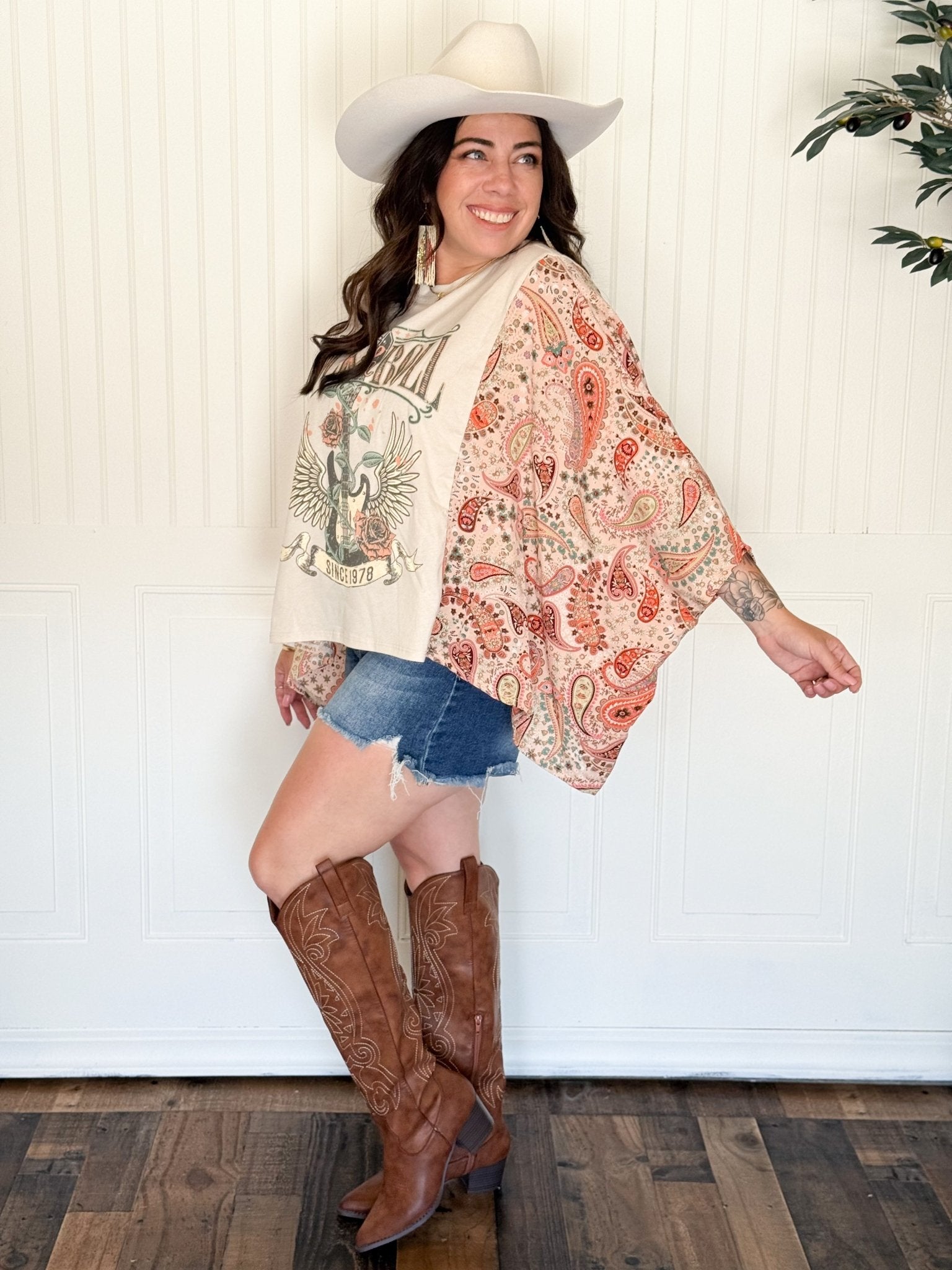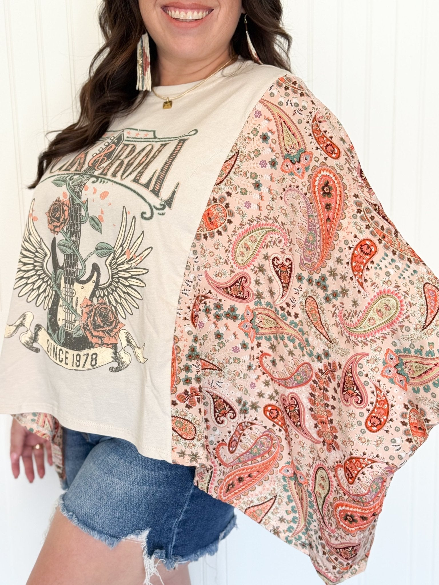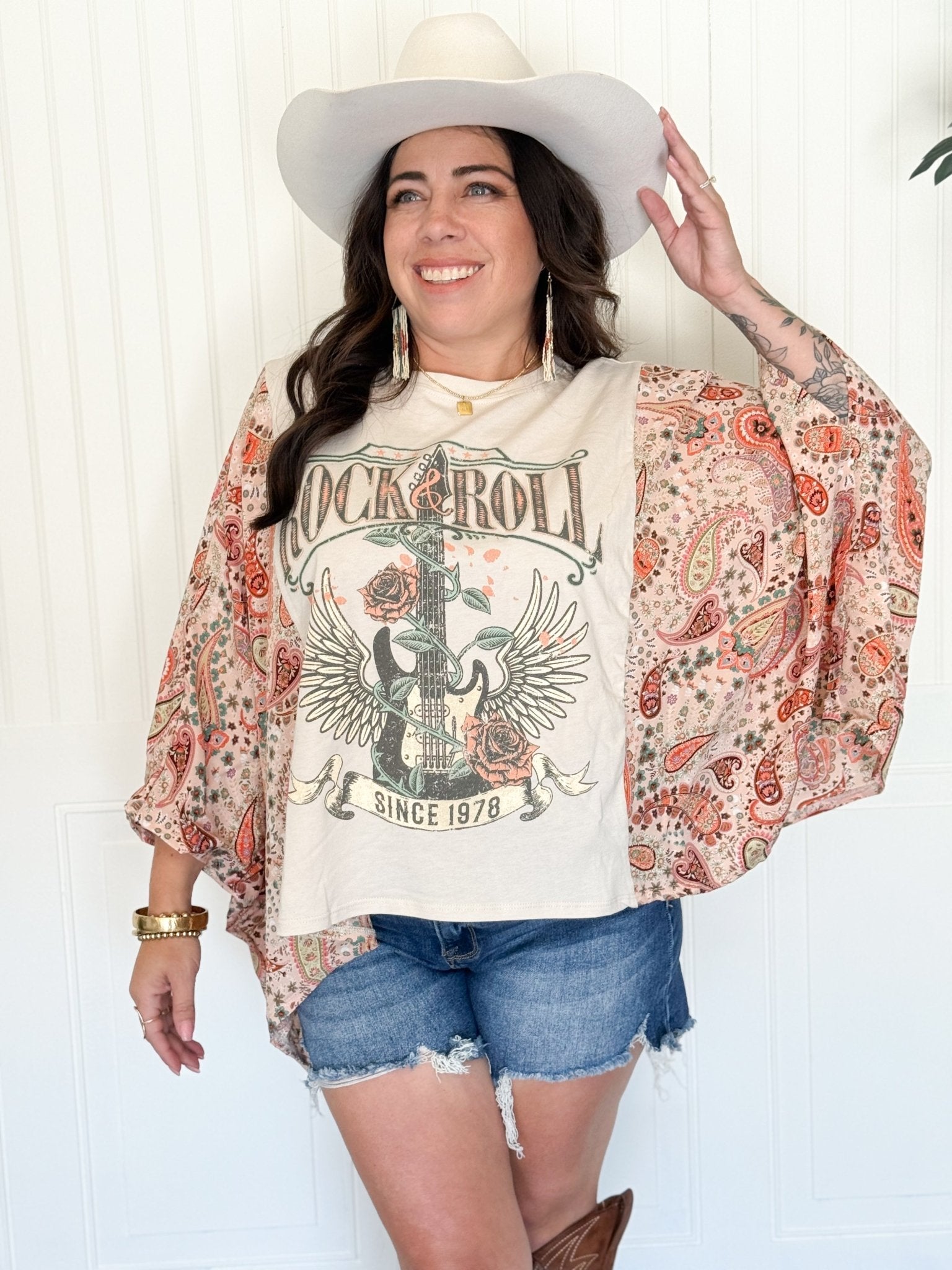 The Rock n’ Roll Kantha Top is where vintage edge meets boho soul. Featuring a bold Rock n’ Roll vintage graphic across the front, this rustic-inspired piece is crafted from lightweight, breathable fabric for everyday comfort. The flowy contrast sleeves, done in kantha-style patchwork, add movement and a one-of-a-kind feel that makes each top unique.