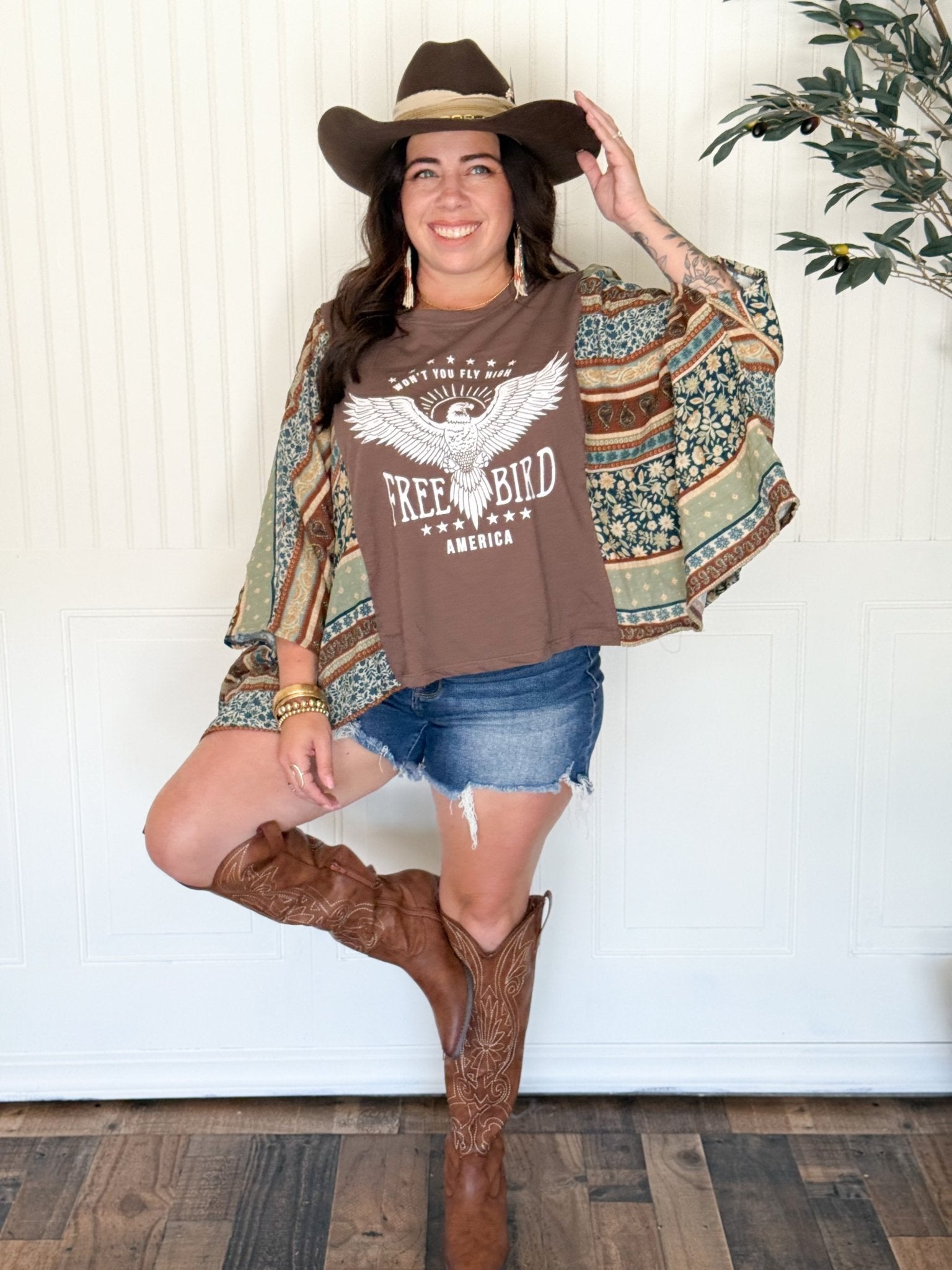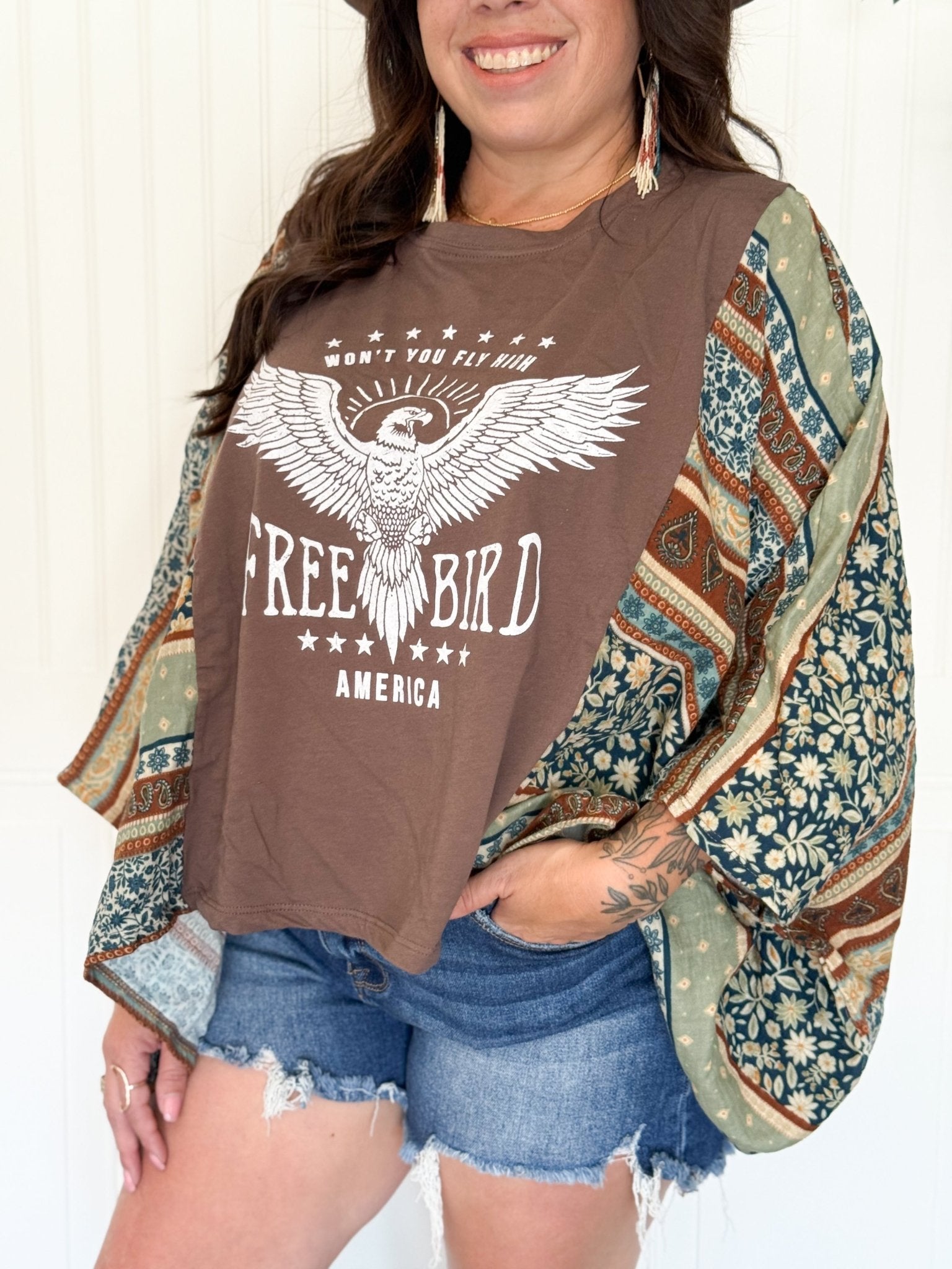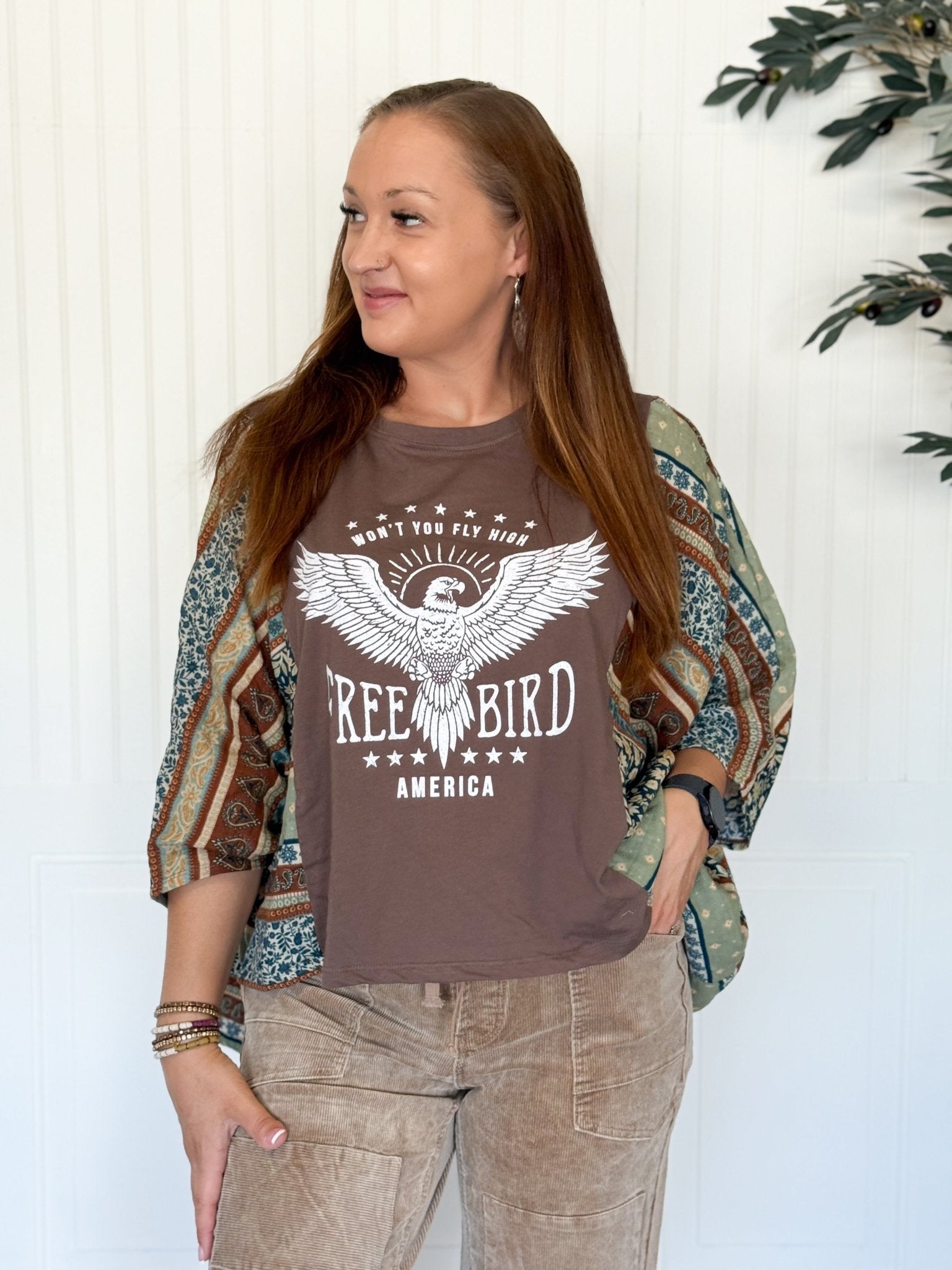 The Free Bird Kantha Top is where vintage Americana meets boho soul. Featuring a bold Free Bird America vintage graphic across the front, this rustic-inspired top is crafted from lightweight, breathable fabric that keeps you cool and comfortable. The flowy contrast sleeves, done in kantha-style patchwork, add movement and a unique, one-of-a-kind charm to every piece.
