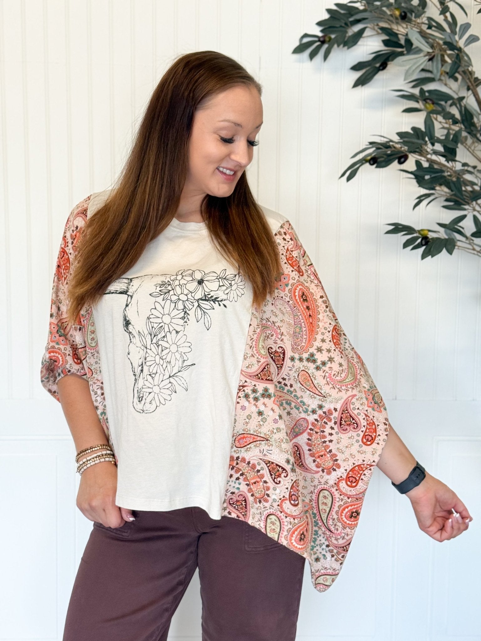 The Floral Longhorn Kantha Top is where western charm meets boho soul. Featuring a bold Floral Longhorn western graphic across the front, this rustic-inspired top is crafted from lightweight, breathable fabric that keeps you cool and comfortable. The flowy contrast sleeves, done in kantha-style patchwork, add movement and a unique, one-of-a-kind charm to every piece.